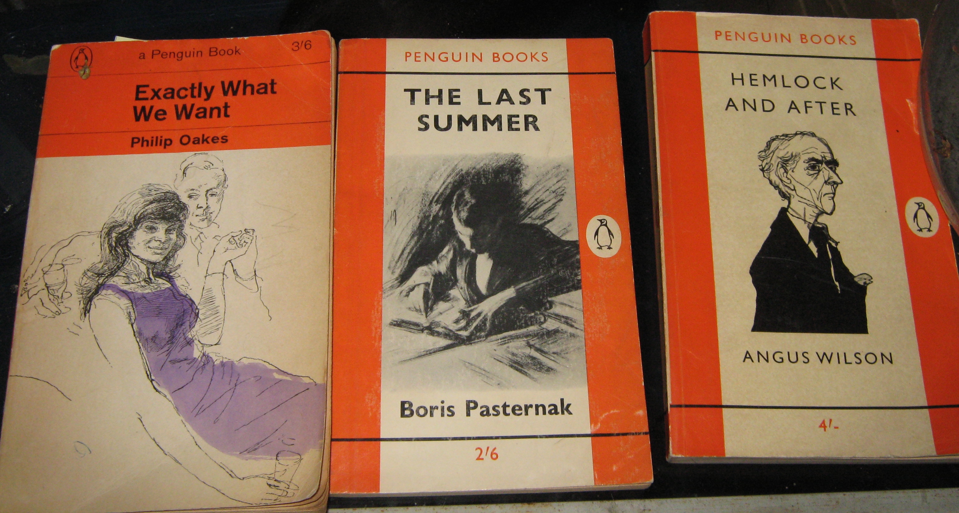 As you can see from the picture at the top of the page, I stocked up on old orange Penguins. I found them at Oxfam, a charity shop, and Skoob, a used bookstore. I have already read and enjoyed Philip Oake’s comic novel about a journalist, Exactly What We Want; and look forward to Boris Pasternak’s The Last Summer, an autobiographical novella; and Angus Wilson’s Hemlock and After. I also picked up old Penguins of Lynne Reid Banks’s The L-Shaped Room (which I read long ago and loved) and Margaret Drabble’s The Realms of Gold, because I feel like rereading it.