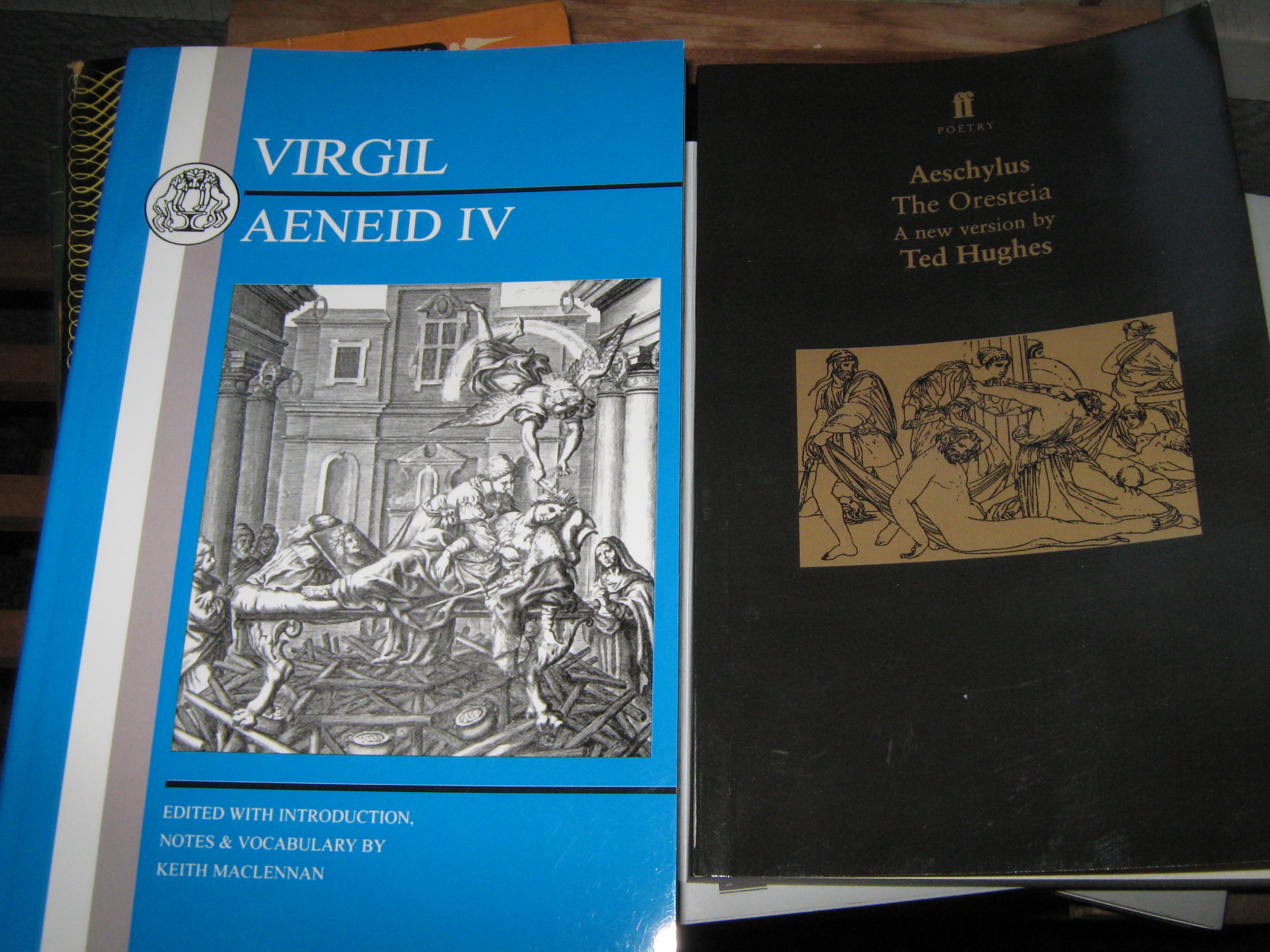 I picked up this nice copy of Virgil’s Aeneid, Book IV, at Foyles. It’s very soothing to read Virgil in a hotel room. Aeschylus’ The Oresteia, translated by Ted Hughes, came from the London Review Bookshop. I meant to see Robert Ickes’ Oresteia in London, but missed it, due to exhasution and confusion about the time.