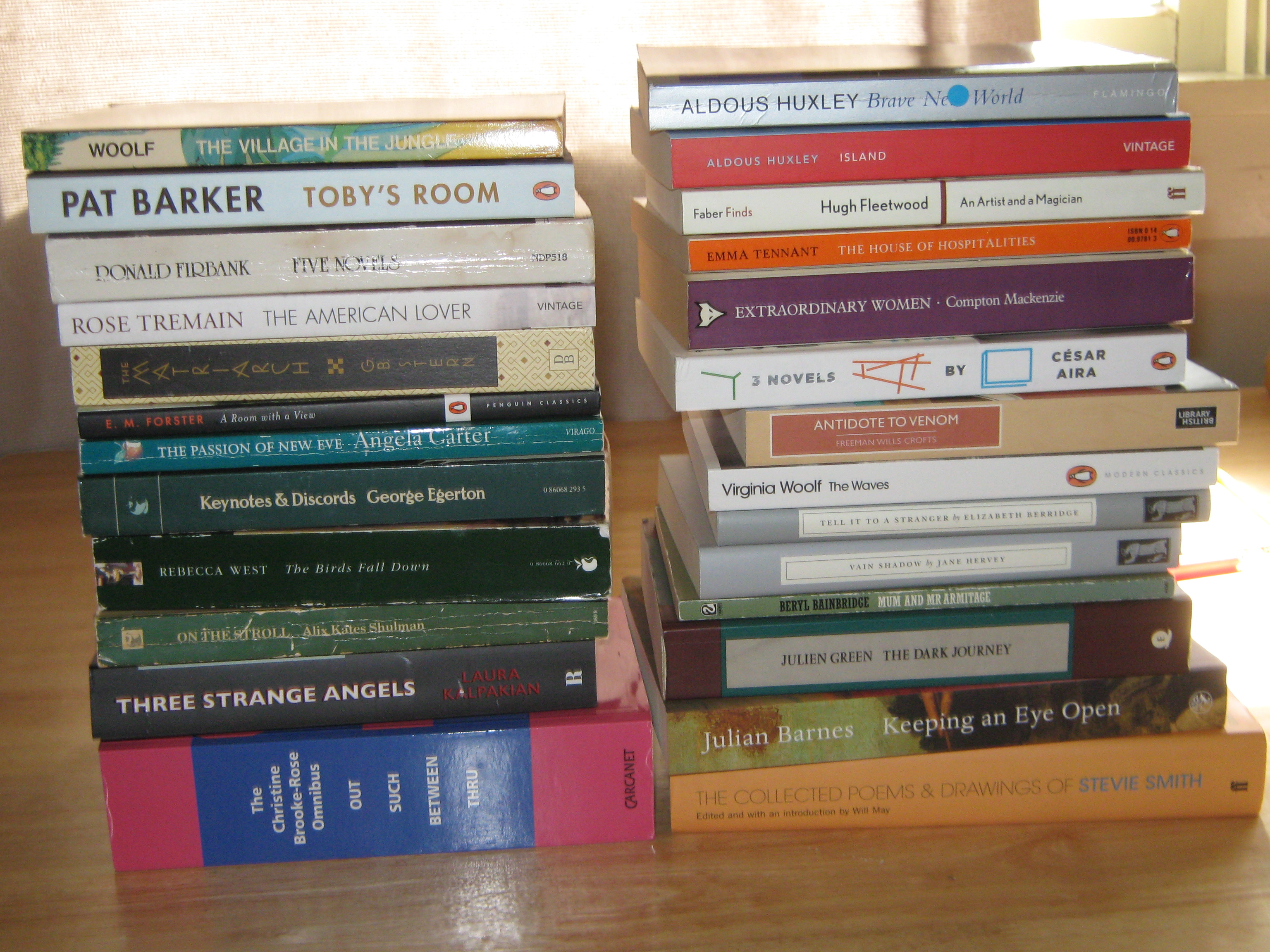 And now for the final picture. Only two in this stack are used: Beryl Bainbridge’s Mum and Mr. Armitage and Julien Green’s The Dark Journey. The Collected Poems & Drawings of Stevie Smith is a stunning book, but I realized after lugging it around London that hardcovers are too heavy for traveling. The same goes for The Christine Brooke-Rose Omnibus, an enormous paperback I’ve been looking for for ages and of course had to buy! Julian Barnes’s paperback, Keeping an Eye on Art, is exquisite. It is now available in the U.S.! Right after I bought it in the UK, of course. Oh well, I love all these books, and no regrets!